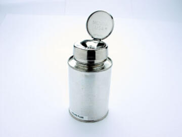 Vätskebehållare med portioneringsskål, lock samt pump med backventil. Portioneringsskålens vätska blandas därmed ej med behållarens vätska. Pumphus i rostfritt stål.